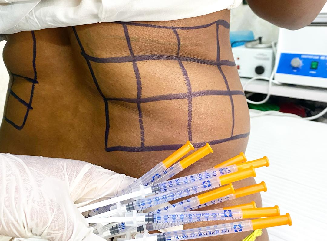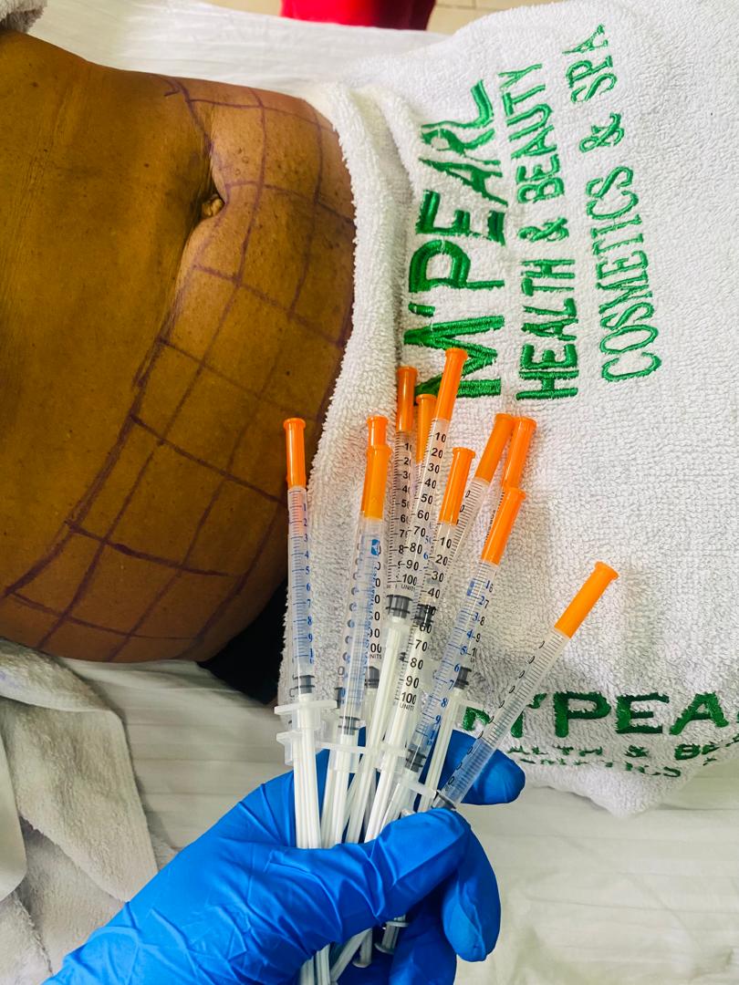- Mesotherapy Fat Reduction: A series of micro-injections of specialized cocktails containing vitamins, minerals, and enzymes to target and dissolve fat in specific areas.