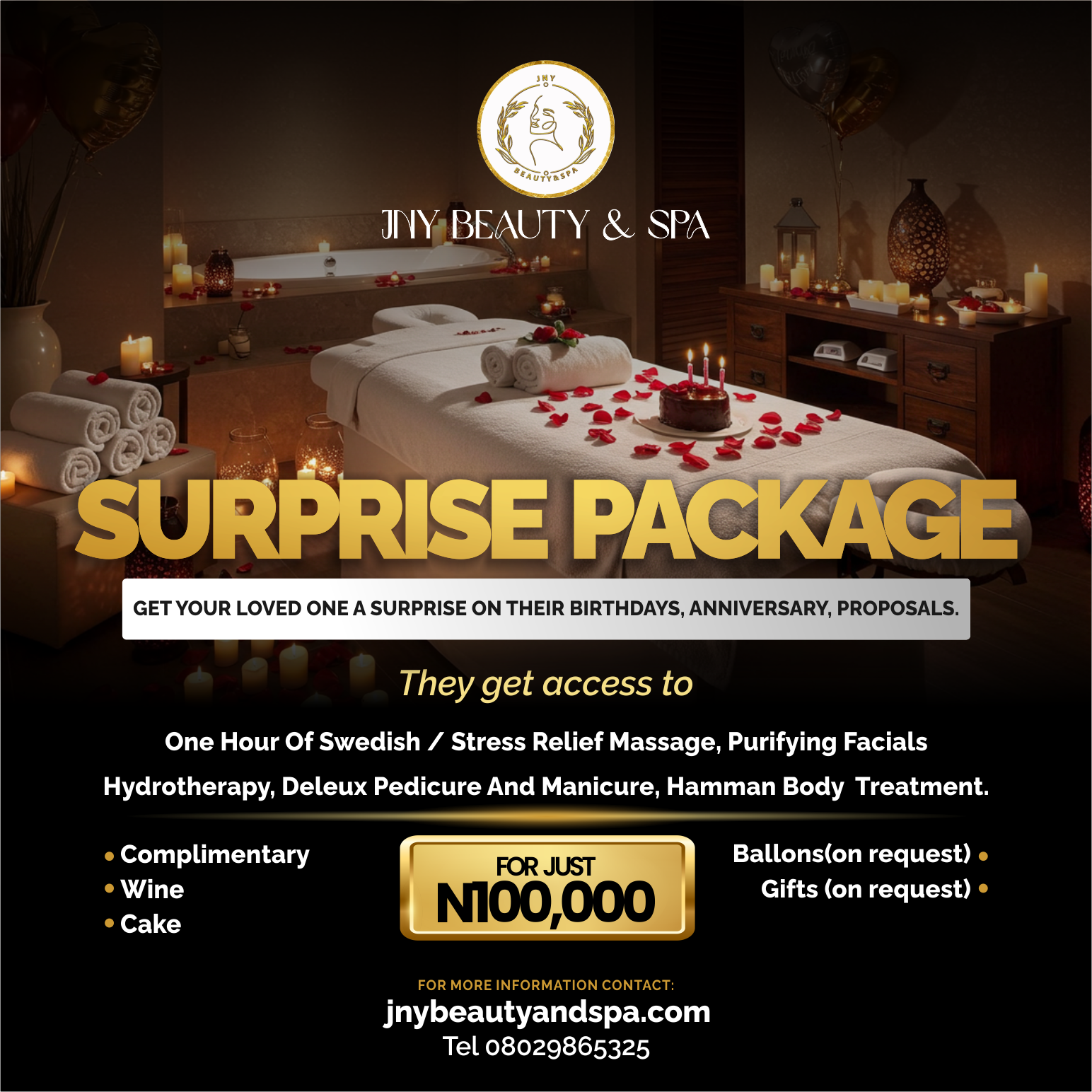 For more information contact 08029865325 or visit wwww.jnybeautyandspa.com
